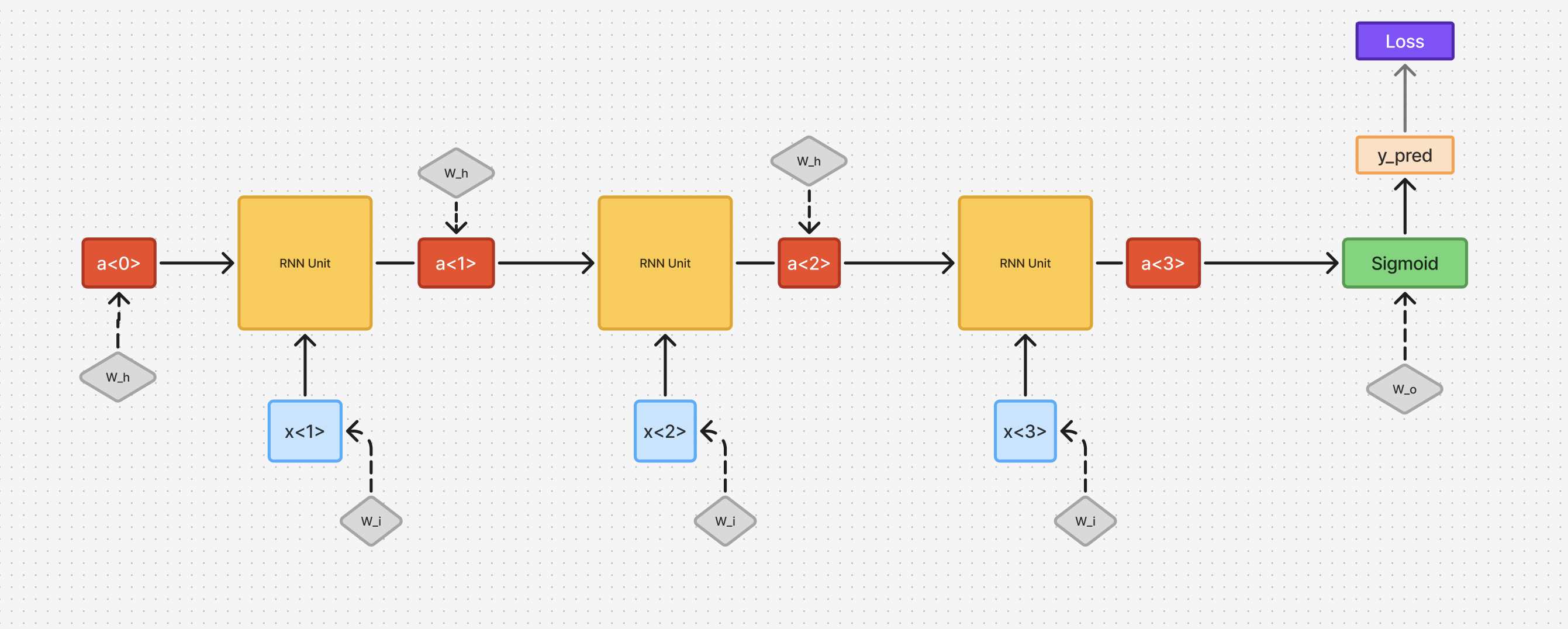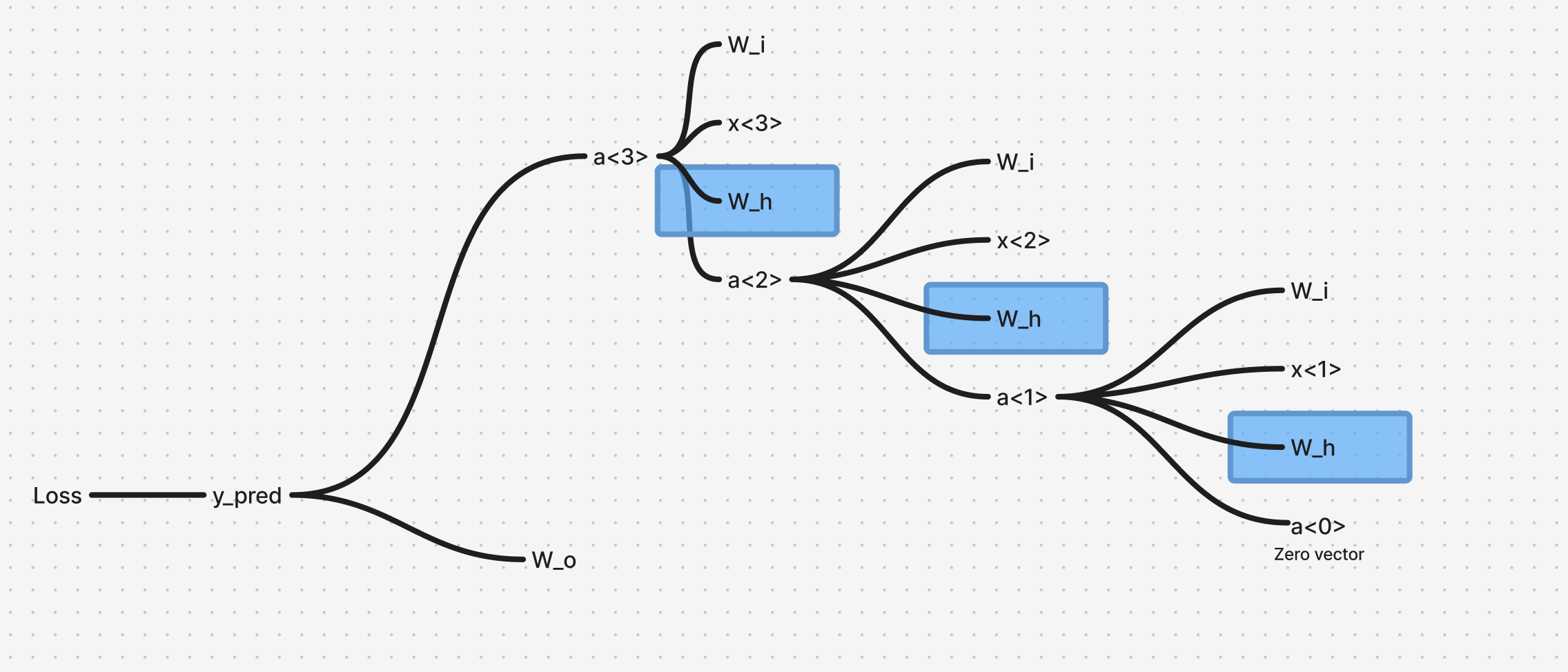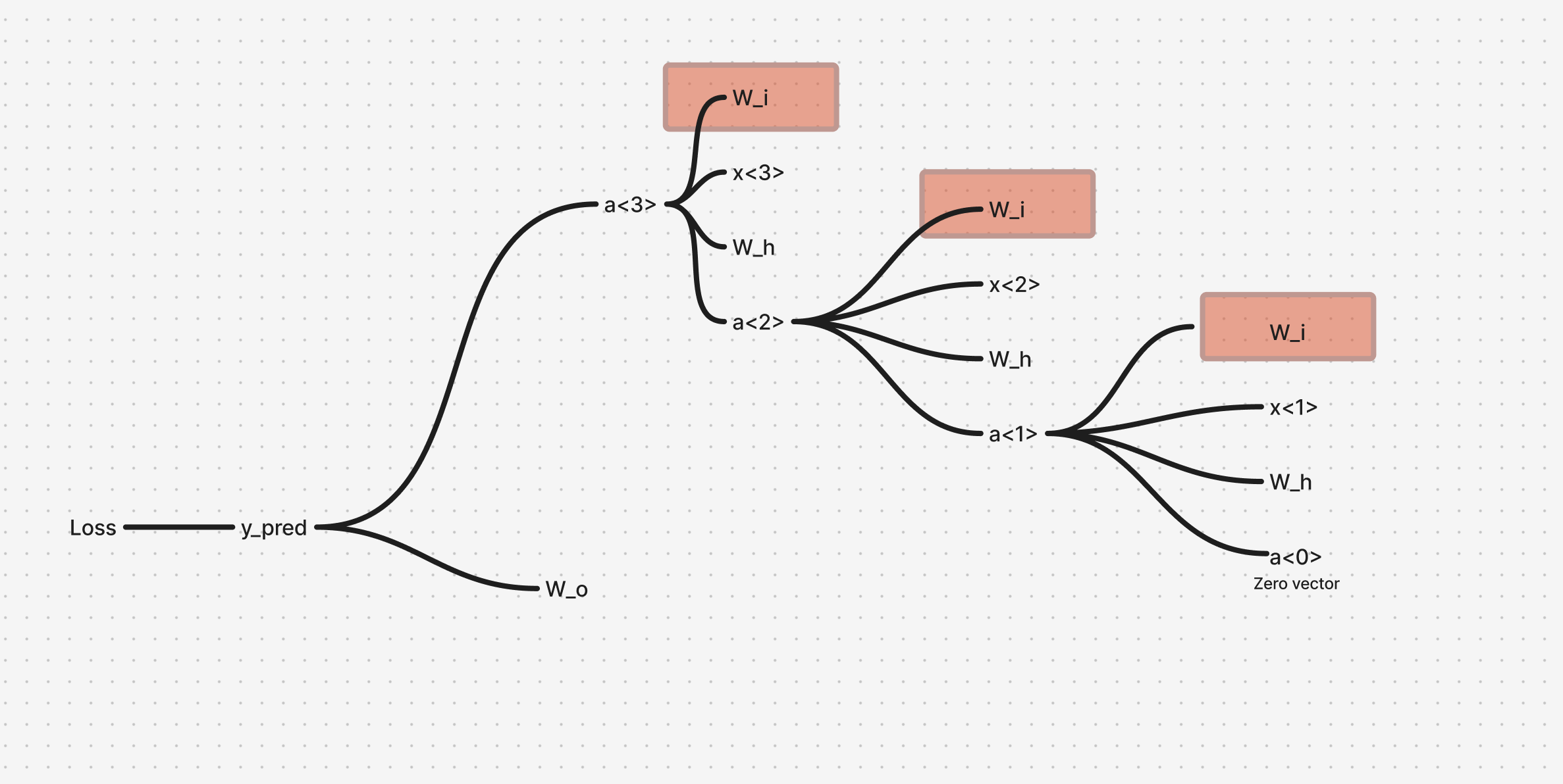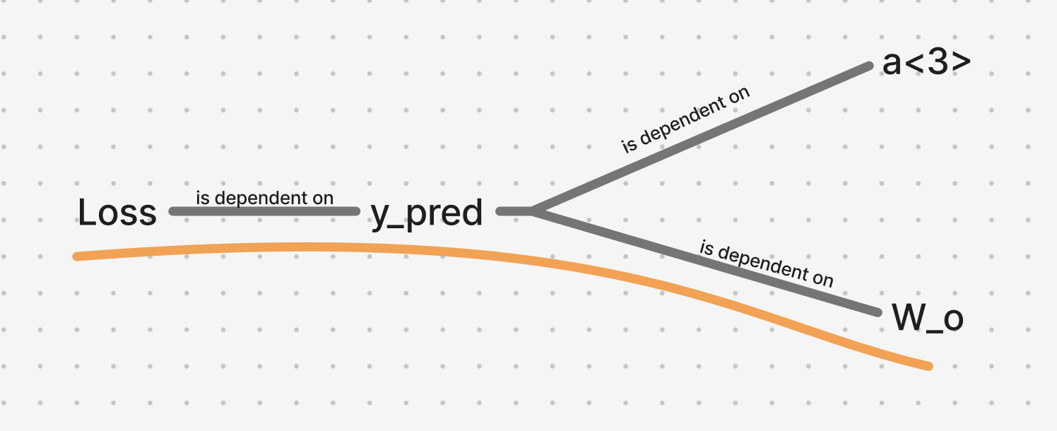 From the above dependency mapping, we have 3 simultaneous dependencies that occur as we move back in timestep from to , which can simply be added together, after calculating the gradient for each timestep.
