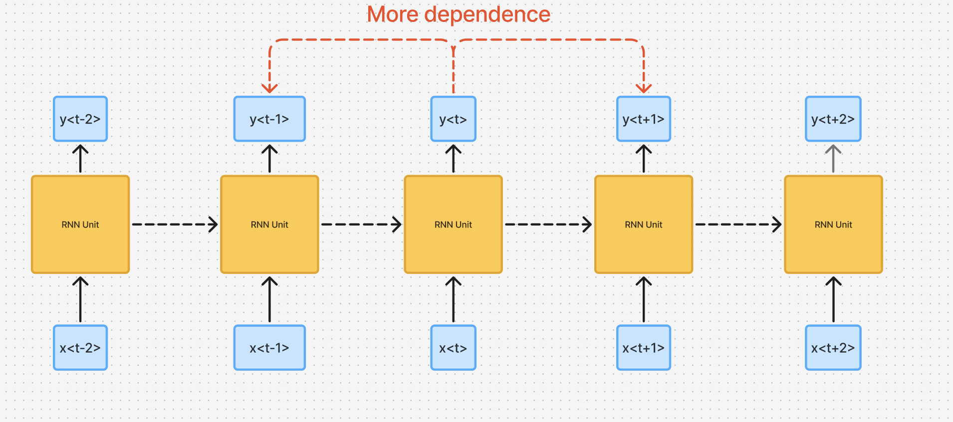 - This is because in this architecture, the output at a timestep is closely associated by neighbors of and not so much by distant neighbors